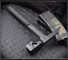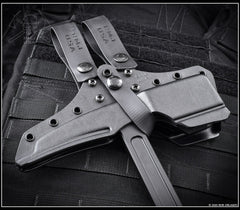 Being a more carry friendly tool than Snuggles, Cuddles includes a molded Kydex Bottom-Eject Scabbard with low ride MOC straps for belt carry. The sheath is compatible with our high ride MOC straps for PALS mounting and also our shoulder strap set up.