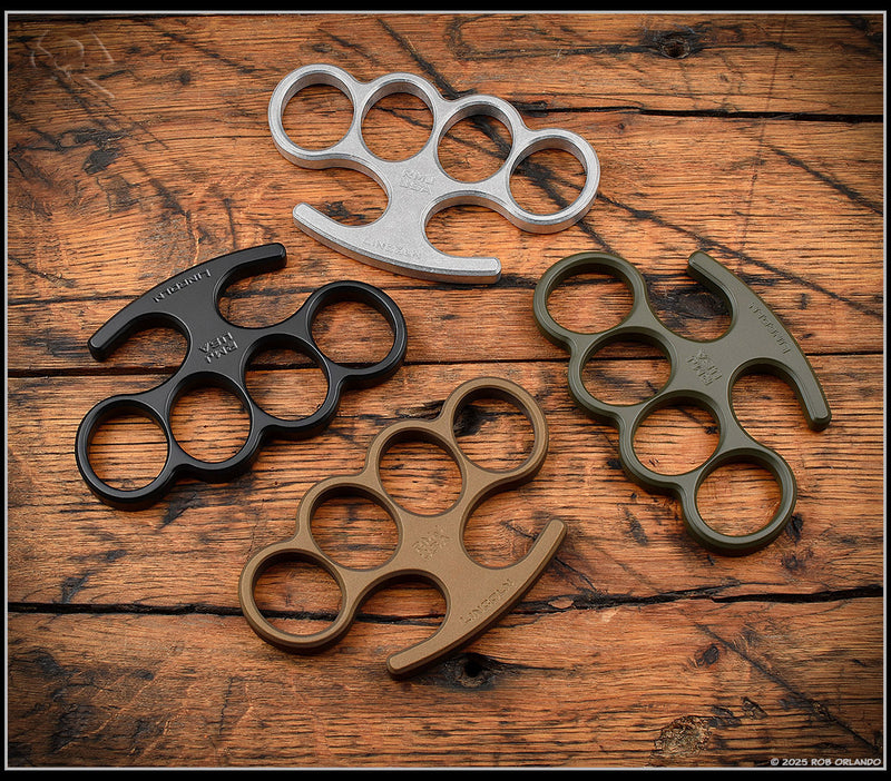 We love multipurpose tools, and our Lincoln Kn*&ks fit that roll in a lot of ways.  Before we get to that, why the name Lincoln?  President Lincoln's personal friend and body gaurd, Ward Hill Lamon, carried this style, so we patterned ours from the original.  He also carried 2 colt .44's, a blackjack, 2 bowie knives, and a cane with a hidden sword.  Who knew that back in the day they needed a four-finger meat tenderizer, napkin holder, paperweight, forehead scratcher, grill adjustment tool?  We wrapped all of those features up in a lightweight 2.2 ounce handful of aluminum which makes them far lighter than brass versions.  Lincoln Kn*&ks will quickly become the centerpiece of your kitchen counter, and a favorite keepsake of the family chef!   You'll find four colorways available, Stonewashed, Black, Bronze and OD Green Cerakote.