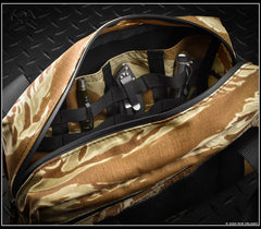 Built from ultra-tough Desert Tiger Stripe 500 Denier Cordura nylon, this bag will hold up to anything you throw at, or in it. The outside of the bag features two quick-access zippered pockets on each side for small gear like knives, magazines, multitools. Both sides also have large loop panels to attach your favorite patches.