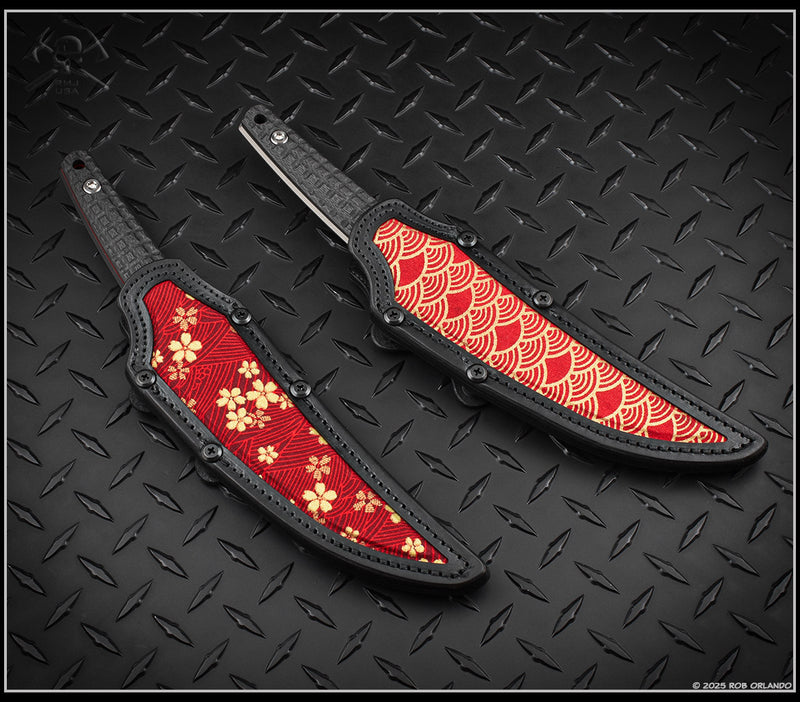 This is the second run of Musashi's, the first being in 2022. This round has a far more elaborate and decorated sheath than the first group. The new sheaths feature Japanese quilting fabric inlays on both sides and a 4-Way belt adapter.