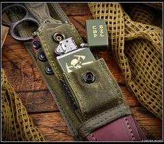 Embodying history and our own design philosophies, the Trench Raider is our rendition of the classic trench knife. We decided to make something that was more true to size vs the behemoth that is Lady Death. The Trench Raiders overall length is 11 3/8" overall length, and has a 7 3/16"" CPM-3V double-edge dagger blade featuring a long fuller down the center. The knuckle duster style handle acts as a guard to protect your hands, and the aggressive outward shape works well for raking. A small detail regarding the knuckles, the style is patterned after the knuckles that President Lincoln's bodyguard carried. The handle is finished with G10 scales with a checkered texture that is suitable in dry or wet conditions. The handles are attached with Grade 5 Titanium fasteners that are electro-anodized in bronze to round out the look. Trench Raider includes a leather and canvas sheath that has a pouch for a lighter mounted on the front. There is also a lighter included, most look like what is pictured, however there are some easter eggs mixed in.